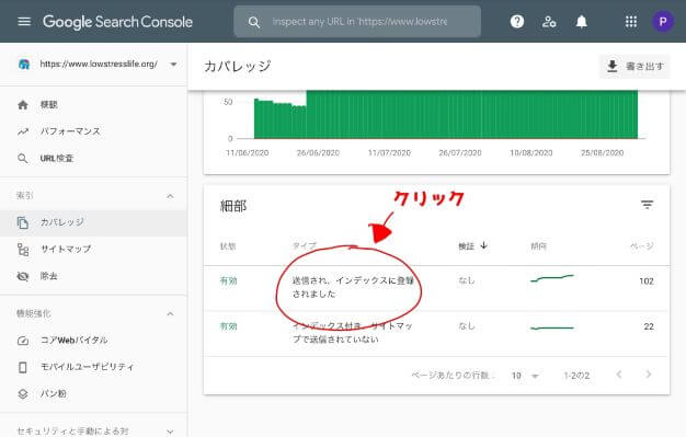 下に「細部」という項目がありますので、「送信され、インデックスに登録されました」をクリック